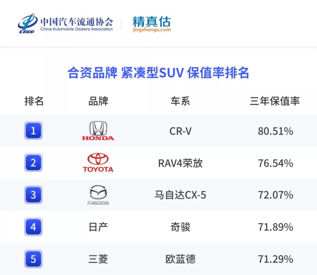 本田CR-V、丰田RAV4荣放、马自达CX-5、日产奇骏、三菱欧蓝德的3年车龄保值率均达到70%以上,其中本田CR-V达到80.51%,是唯一保值率超过80%的车型。在自主紧凑型SUV中,哈弗H5、领克01、北京BJ40、长安CS75保值率在60%以上。