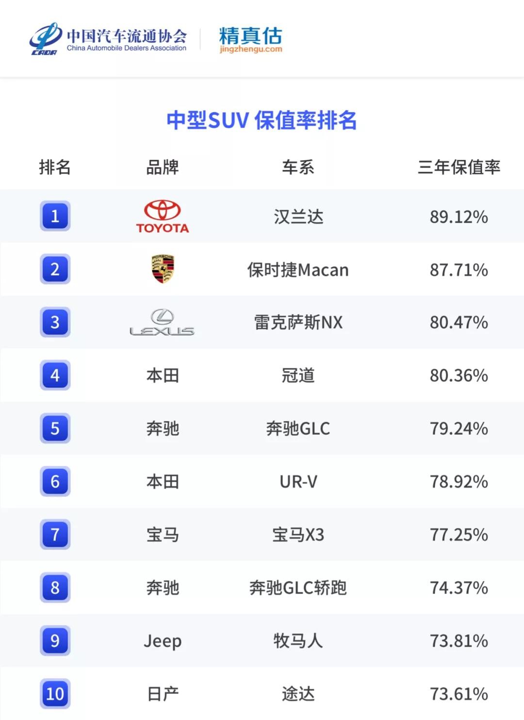 丰田汉兰达三年保值率达到89.12%,保时捷Macan和雷克萨斯NX保值率分别为87.71%和80.47%,本田冠道为80.36%。