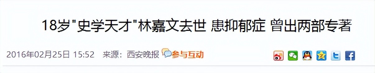 西安晚报2016年2月25日---18岁"史学天才"林嘉文去世 患抑郁症 曾出两部专著