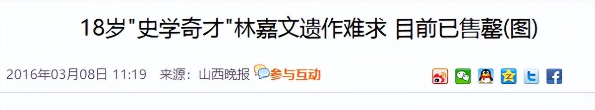 山西晚报2016年3月8日---18岁"史学奇才"林嘉文遗作难求 目前已售罄(图)