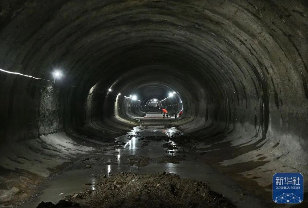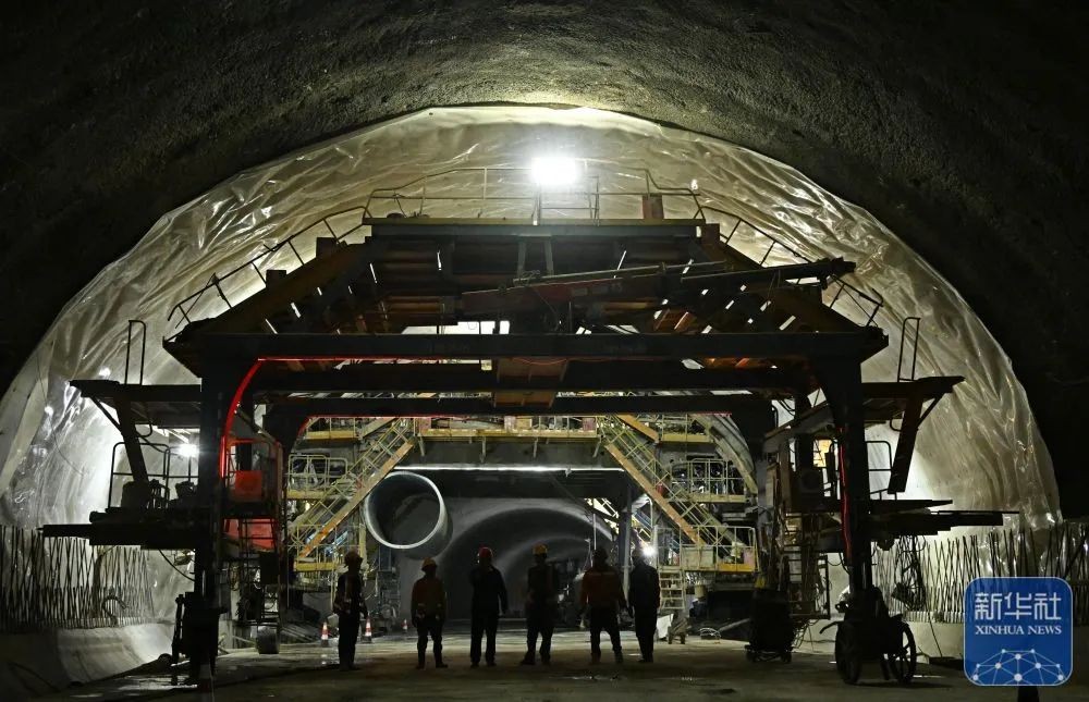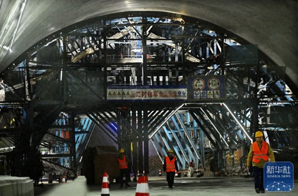 工人从胶州湾第二隧道TJ-02标段一处施工点经过