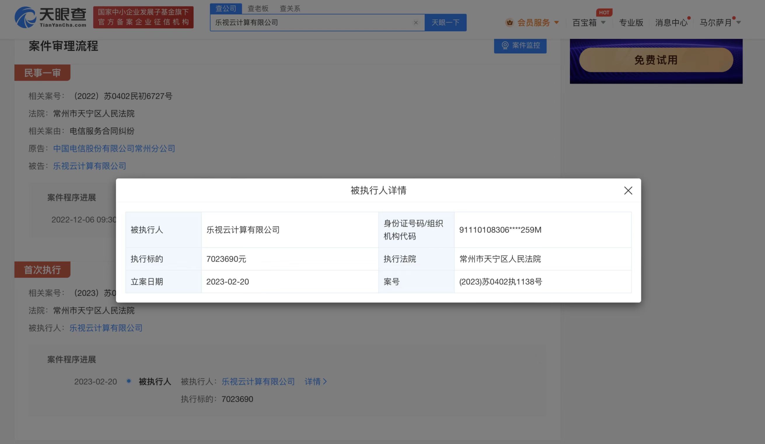 近日,记者从天眼查App获悉,乐视云计算有限公司新增一则被执行人信息,执行标的702万余元,关联案件为中国电信股份有限公司常州分公司与该公司相关服务合同纠纷,执行法院为常州市天宁区人民法院。