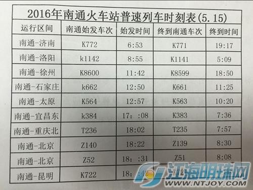原先从南通到汉口的K384次将从5月15号起,延伸至宜昌东。南通到兰溪的T7788次停开。南通到济南、徐州、太原、北京、昆明方向车次不变。
