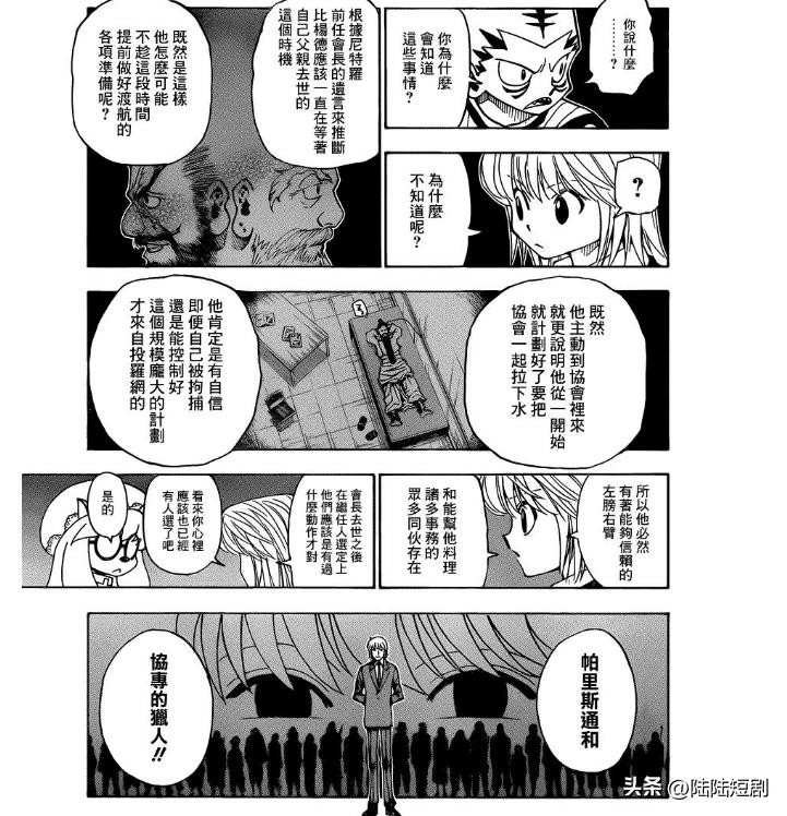 画面一转351话,旅团团长和西索开启了世纪大战,两个大佬各显神通,团长借走了马奇、侠客、库必三人的能力,尽管如此西索一开始还是非常从容,最后在团长的人海战术下西索安详的被干掉了,但是团长库洛洛也失踪了