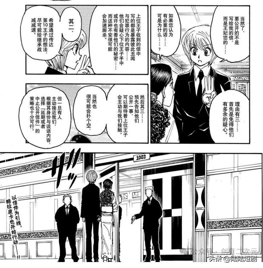 画面一转,是旅团团长黑着脸出现在船上底层,团长非常不悦,大概率是找西索报杀库必和侠客的仇的,也就说西索也在这艘船上。酷神一会人回去后,第五王子的私设兵队长就来了,希望用缔结和平来交换念能力的情报,酷神同意了,随后便开始讲解念,突然在上方的中央空调出气口传出了异样的声音,疑似是蟑螂发出的,这下酷神犯难了,如果这时候让王妃用自己的能力捕捉蟑螂然后用能力控制,如果不动手的话下次想要再捕捉到对方就很难了,酷神灵机一动让另一个十四王子的警卫假装用念能力示范抓捕奸细蟑螂,实际则是由王妃使用酷拉皮卡的能力之一海豚,附身在蟑螂身上趁机窥探其余王子的情况,在几人的精妙配合下把所有人都耍的团团转,就在王妃爬到十二王子房间的时候发现,私设兵掐死了正在熟睡的十二王子,王妃吓得大叫,酷神赶忙掩饰说王妃是做了噩梦,但是王妃一定要求要去救十二王子,这也引起了私设兵的怀疑。