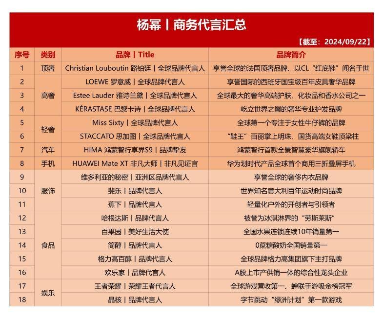 从高端奢侈品到日常消费品,杨幂的代言品牌种类繁多,且都是行业内极具影响力的品牌,也都是最高title:路铂廷全球品牌代言人,雅诗兰黛全球品牌代言人,LOEWE罗意威全球品牌代言人,巴黎卡诗全球品牌代言人,MISS SIXTY全球品牌代言人,思加图全球品牌代言人,鸿蒙智行享界S9品牌挚友,华为MATE XT三折叠非凡见证官,维多利亚的秘密亚洲区品牌代言人,欢乐家品牌代言人,简醇品牌代言人,FILA代言人,晶核品牌代言人,王者荣耀荣耀王者代言人,蕉下品牌代言人,百醇品牌代言人,哈根达斯品牌代言人,百果园美好生活大使,丝塔芙全新亚太区品牌代言人。可以说是把人们日常的吃穿用度全部囊括,商业价值可见一斑。
