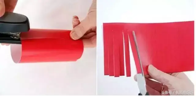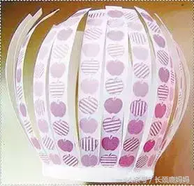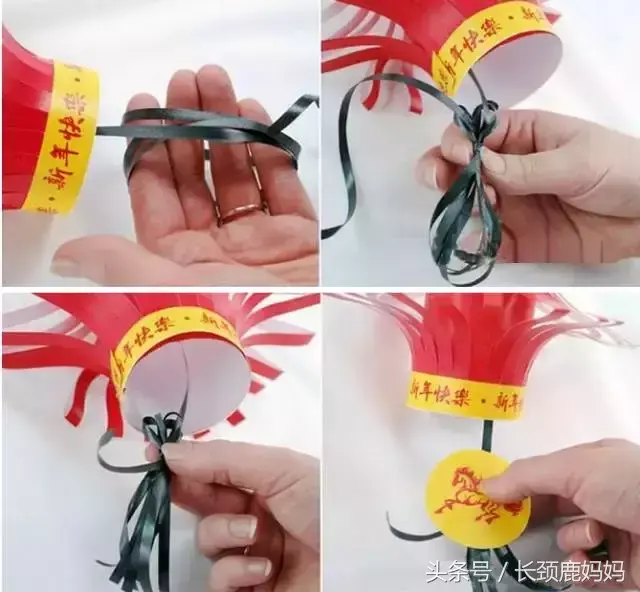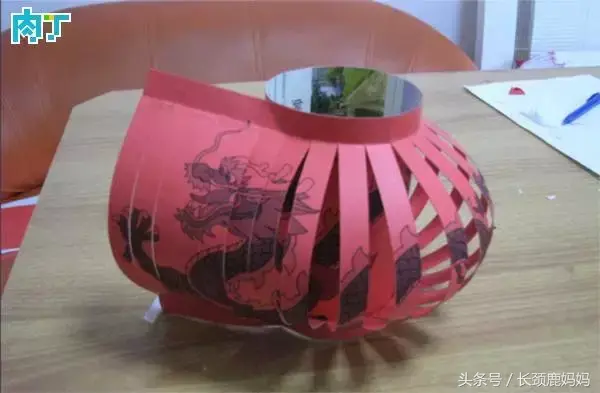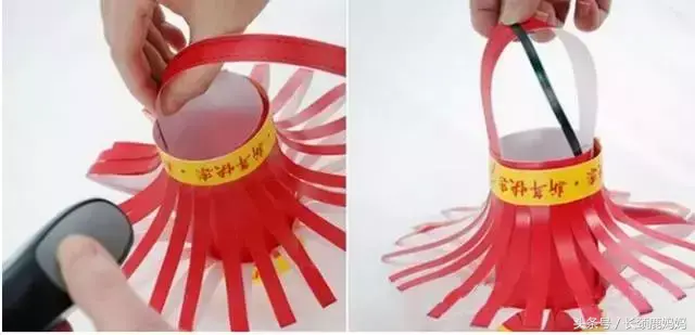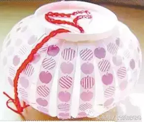 先在两个底部的中心钻孔穿红线,然后将两只纸杯的条状对应粘接好,灯笼基本成形了。在上下底部粘上彩纸包边,底部中心挂上灯笼穗子,会更有感觉。可以用颜料将灯笼涂成喜庆的红色。