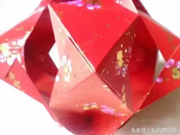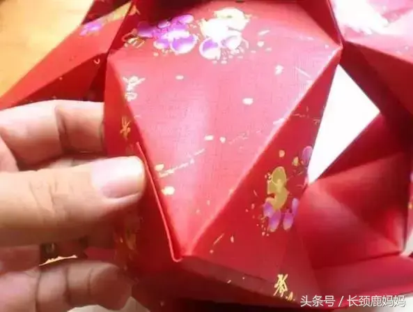 8. 同样方法,用另外6个红包封制作灯笼的下半部。两部分都完成后,把向下折的两个角订在一起,如图