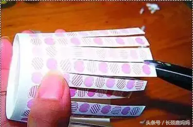 步骤:取一只纸杯,尽量选择横竖有参考图案的,比如这个苹果图案的。沿纵向条纹均匀剪开,成一个个条状。