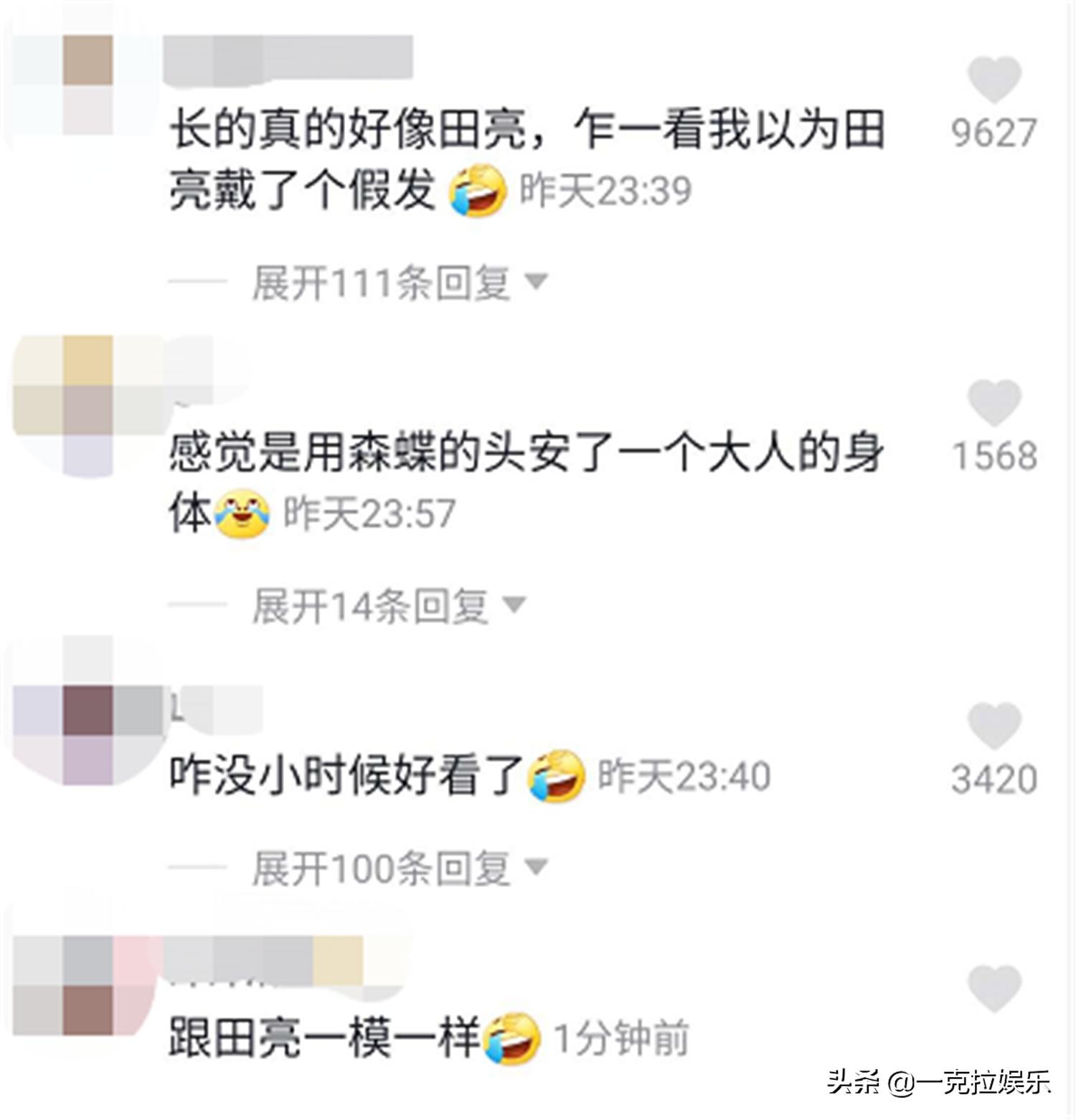此次森碟的五官也成为网友们热议的话题之一,很多网友都说长得越来越像爸爸田亮,咋一看,以为田亮戴了个假发。