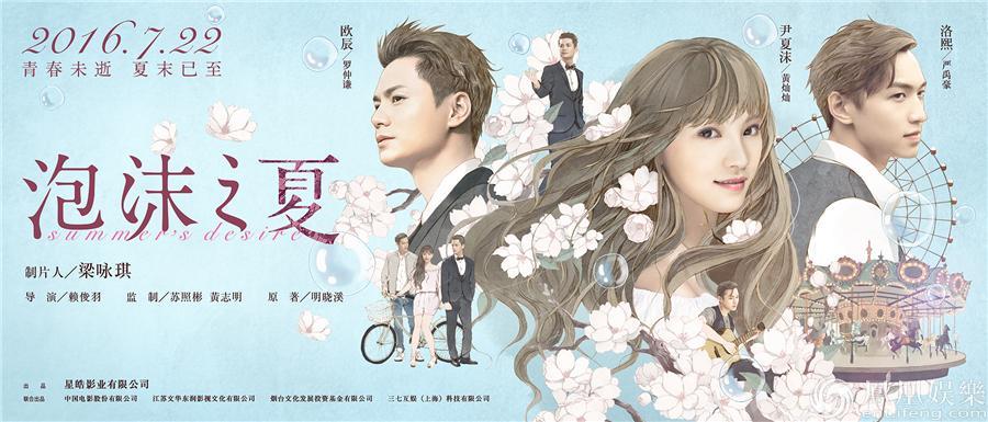 由梁咏琪制片,赖俊羽导演,苏照彬、黄志明监制,罗仲谦、黄灿灿、严禹豪、王冠逸、陈雅丽主演的浪漫爱情电影《泡沫之夏》即将于7月22日上映。今日官方终于曝光终极海报,此款海报风格继续延续影片的“梦幻少女”风格,以蓝色为底,采用半写实的漫画形式,用充满浪漫气息的樱花围绕三位主演,青春唯美的少女风格再次提升了电影的期待值。(图为泡沫之夏终极版海报)