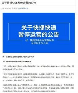 - 快捷快递正式宣布全网暂停运营 自曝申通在快运合作上“极为不配合” 每经记者:李卓 每经编辑:梁秋月 4月18日,快捷快递官方微信公众号发布《关于快捷快递暂停运营的公告》,宣...