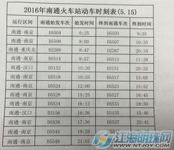 - 南通火车站发布新版列车时刻表 到南京每天10班动车 江海明珠网讯(记者 王艳霞)南通火车站今天对外发布新版列车时刻表。5月15号起,南通站将新开至南京、汉口、重庆北方向的动...